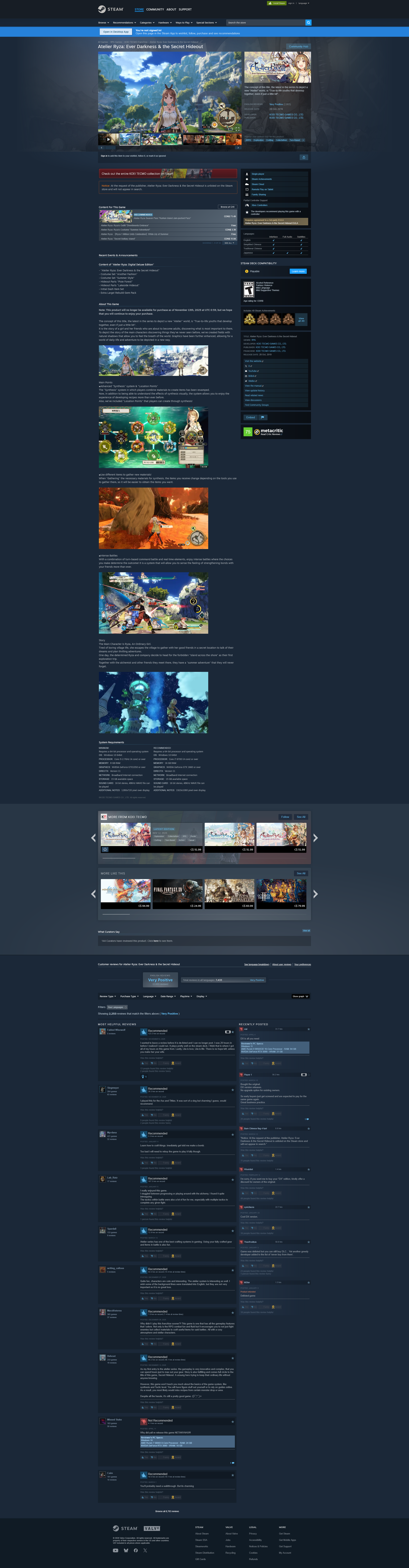 I 100%'d all the Steam achievements on Atelier Ryza (local, 2026) this week, as a tribute to it. It ended up taking a couple more days to do, because while I had completed the base game, it was a close fight, and there were optional bosses that I needed to kill in order to get all the remaining achievements. To do that, I checked a couple guides and saw instructions on how to break the game via crafting, which seems to be an Atelier game series thing to do in general.. so I set to work and broke the game, crafted a bunch of really powerful gear, and then went in and smashed a few optional boss faces for the 100%. Good stuff.