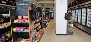 This was a cashierless, contactless store called Aisle 24 and the way the store worked, only one person is allowed in the store at a time. The front door was like an airlock — to get into the shop proper, one needs to press a button on their phone app to unlock the door, then go into the airlock area, have the front door close completely behind them, then (assumedly) once the camera detects that only one person is inside the airlock area, the inner door will open and let them in. I’m not sure what happens if more than one person tries to go in at once, or is queued up, but the signs did say that only one person at a time was allowed in the store.