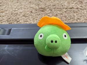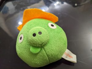 We have an Angry Bird plushie. I’m not sure why. I don’t have any history of this plushie at all — when we got it, who got it, why we got it, how much it cost… no idea. But it exists, and is one of the remaining 42 or so plushies I have that haven’t been featured, so here it is! I haven’t played any Angry Birds at all besides maybe randomly trying it out for 5 minutes one time. I don’t even know who this character is in the game, I just know that it’s a pig, but I have so little interest in the franchise that I can’t even be bothered to look it up enough to understand which pig it is or what their role in the story is.