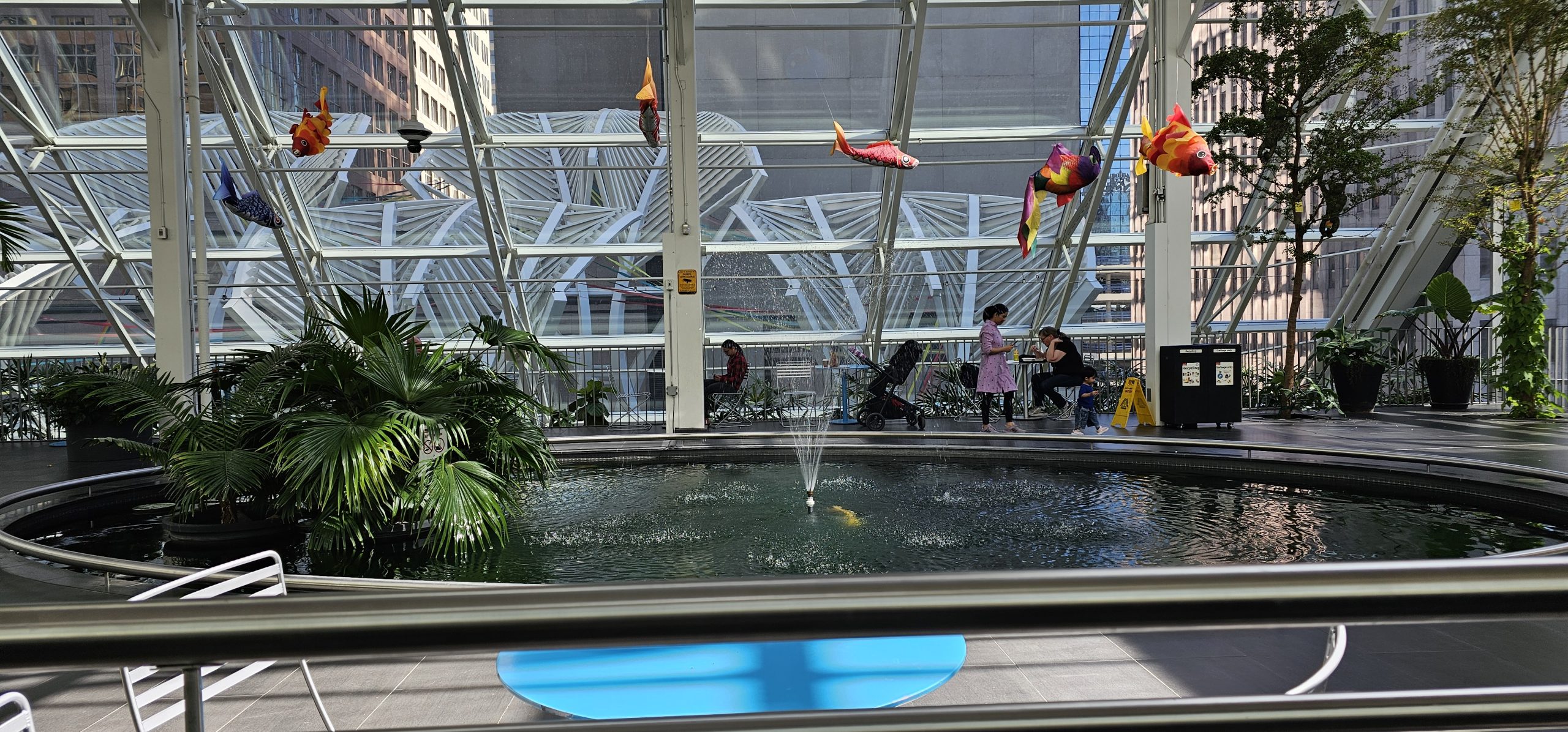 Then I headed to a place that I had actually already scouted out before, the Devonian Gardens located on the fourth floor of a mall. I came here back in 2021 during my Calgary Stampede trip. I remembered that there were some tables there, even though they had no power sockets next to them (the third level of the same mall did have tables with power sockets though, but they were occupied). But that was good enough for me anyway, so I sat down there for about an hour and change to rest and work on the blog. I even saw an indoors bird and wondered if that bird was trapped in there. And I saw someone dancing while his companion took several videos of him.