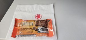And as per standard for Air Canada short-haul flights, there was no meal and just some lousy snacks. In this case we had the choice between Twigz Buttery Herb & Garlic Pretzels, and Leclerc Celebration Cookies. I took the chocolate cookies. Sorry, did I say cookies? Cookie. And my usual tomato juice, of course, while I watched the mountains go by below.
