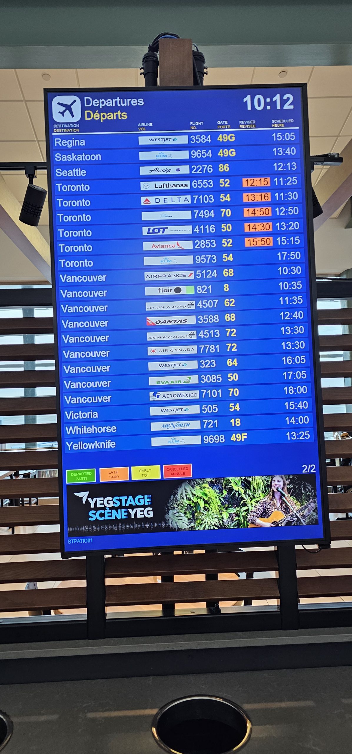Oh well. I was there early after all anyway, and even after that debacle it was only 9:36 am. Unlike the flights to Toronto, the Vancouver planes were all still on time but boarding for my flight wasn’t until 11 am, so I had some time to kill and walked around the airport.