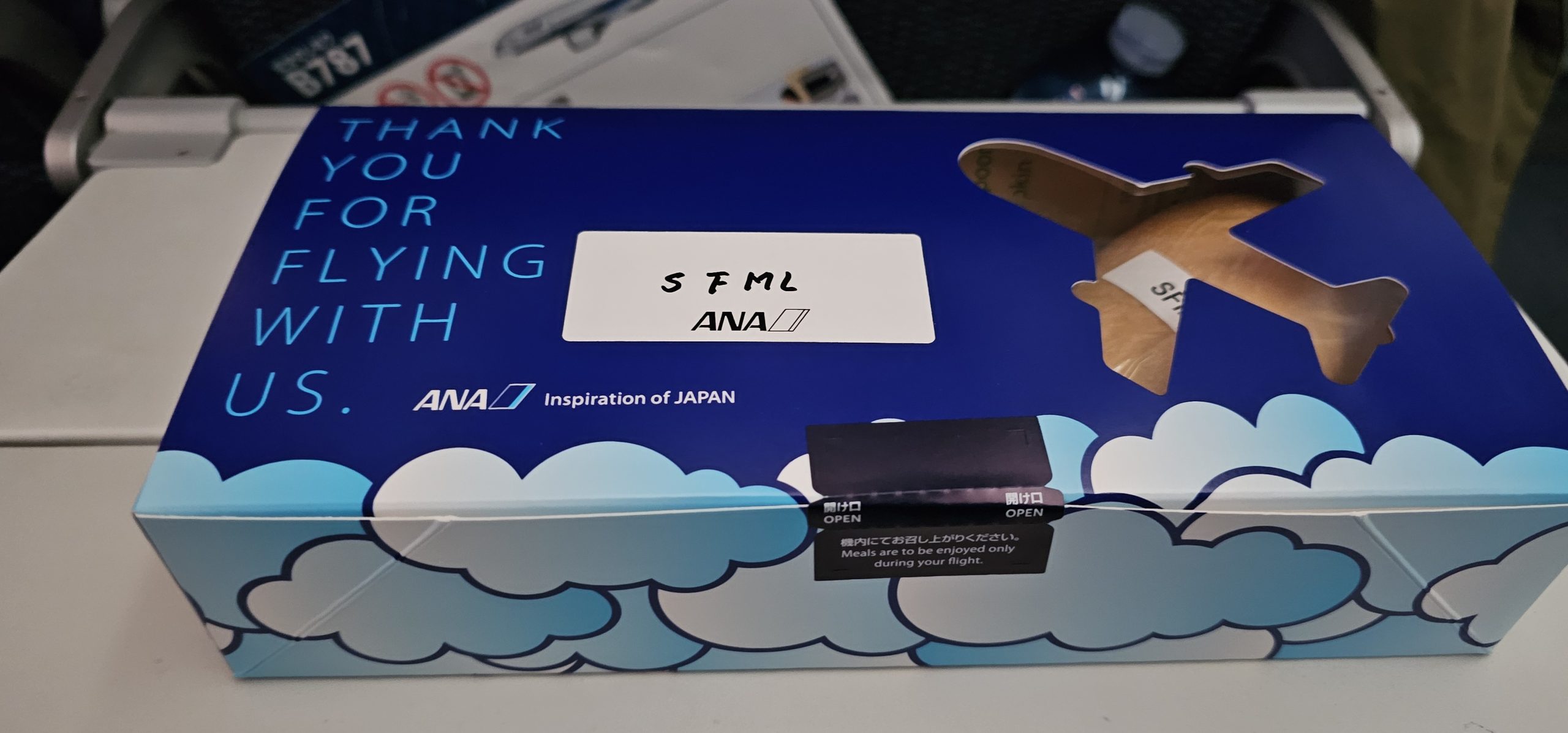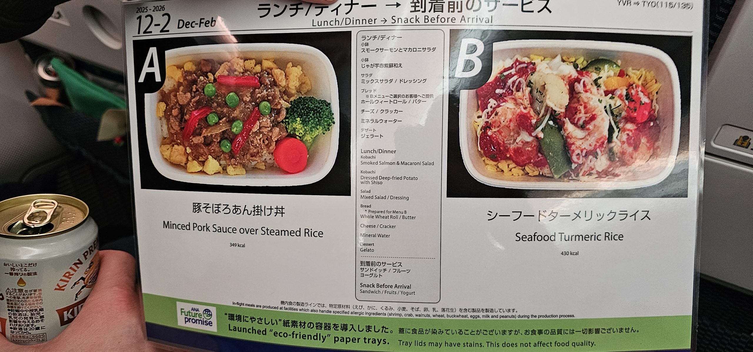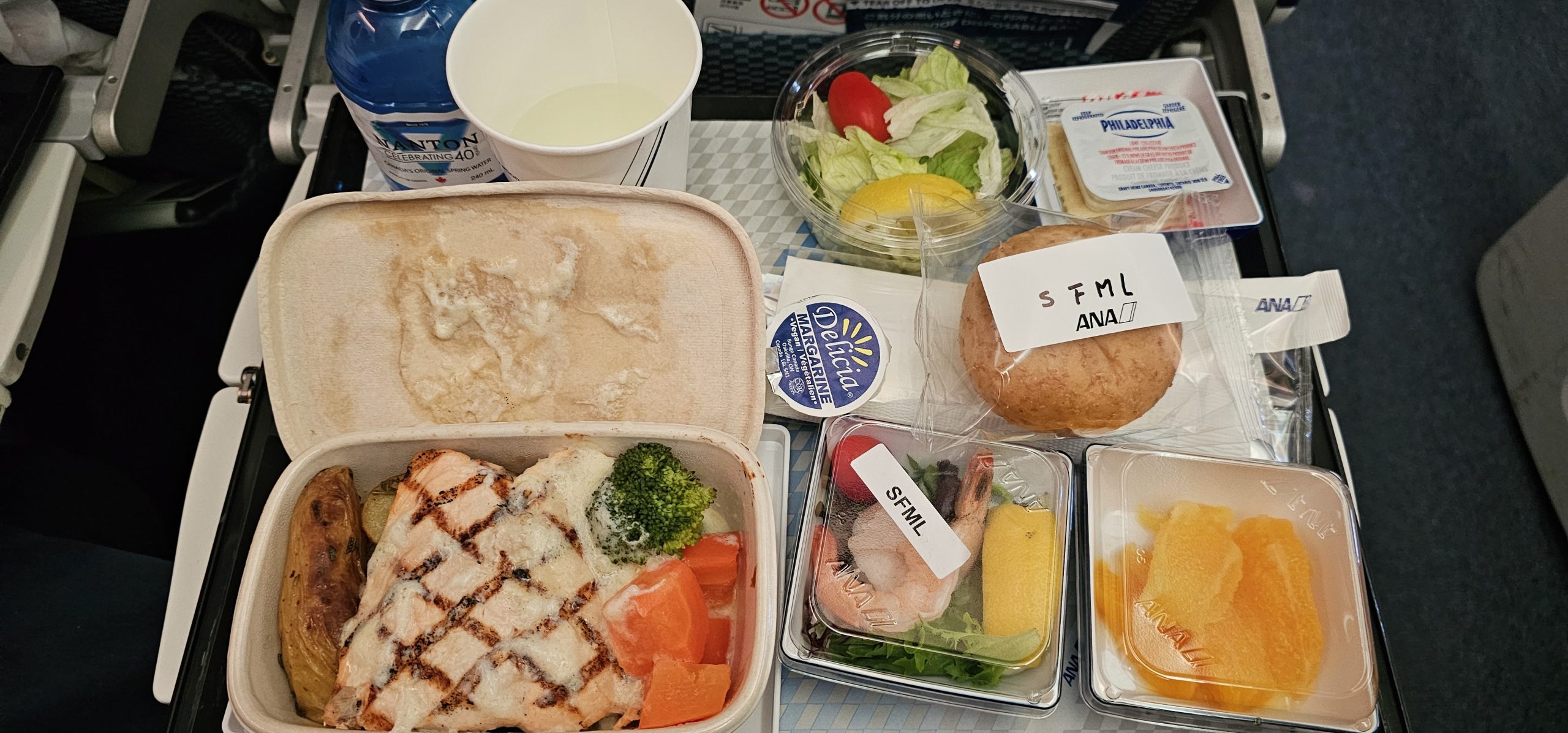 One of the options when booking the ticket with ANA was a choice of in-flight meals, and like the last time I did this, I ordered Seafood Meal for both meals. This turned out to be only one hot meal — although this was an Air Canada meal, it was an ANA led flight and I guess they only give one hot meal for their 9 hour intercontinental flights. For all I dislike both Air Canada and Westjet, I believe both of them do two hot meals plus breakfast. At least the last time I remember sitting on those flights.