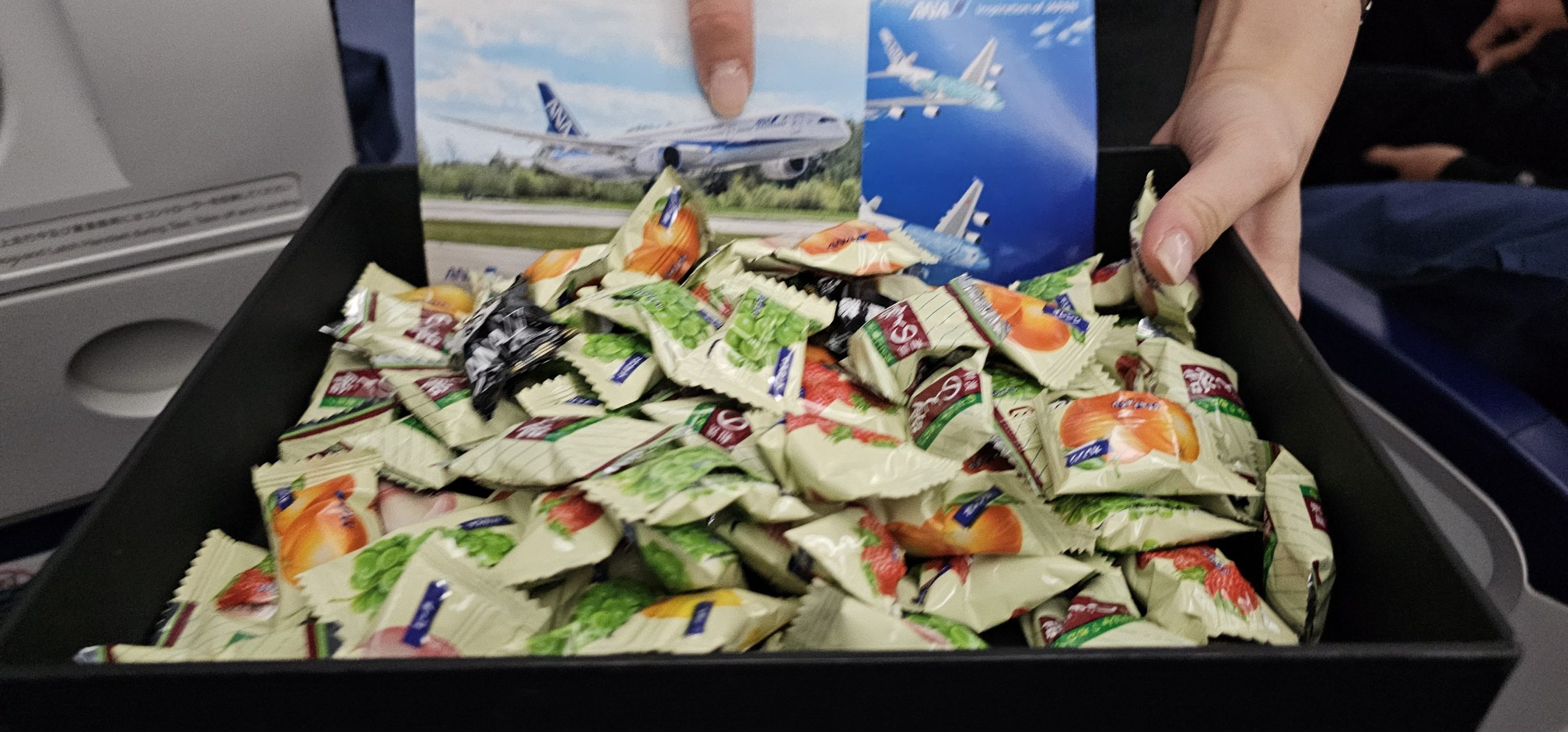 Why yes, I did help myself to a little bit. They did give out a lot of drinks all in all, and I had tomato juice (my usual) x2, apple juice, Japanese lemonade, green tea, and black tea at various points in the flight.