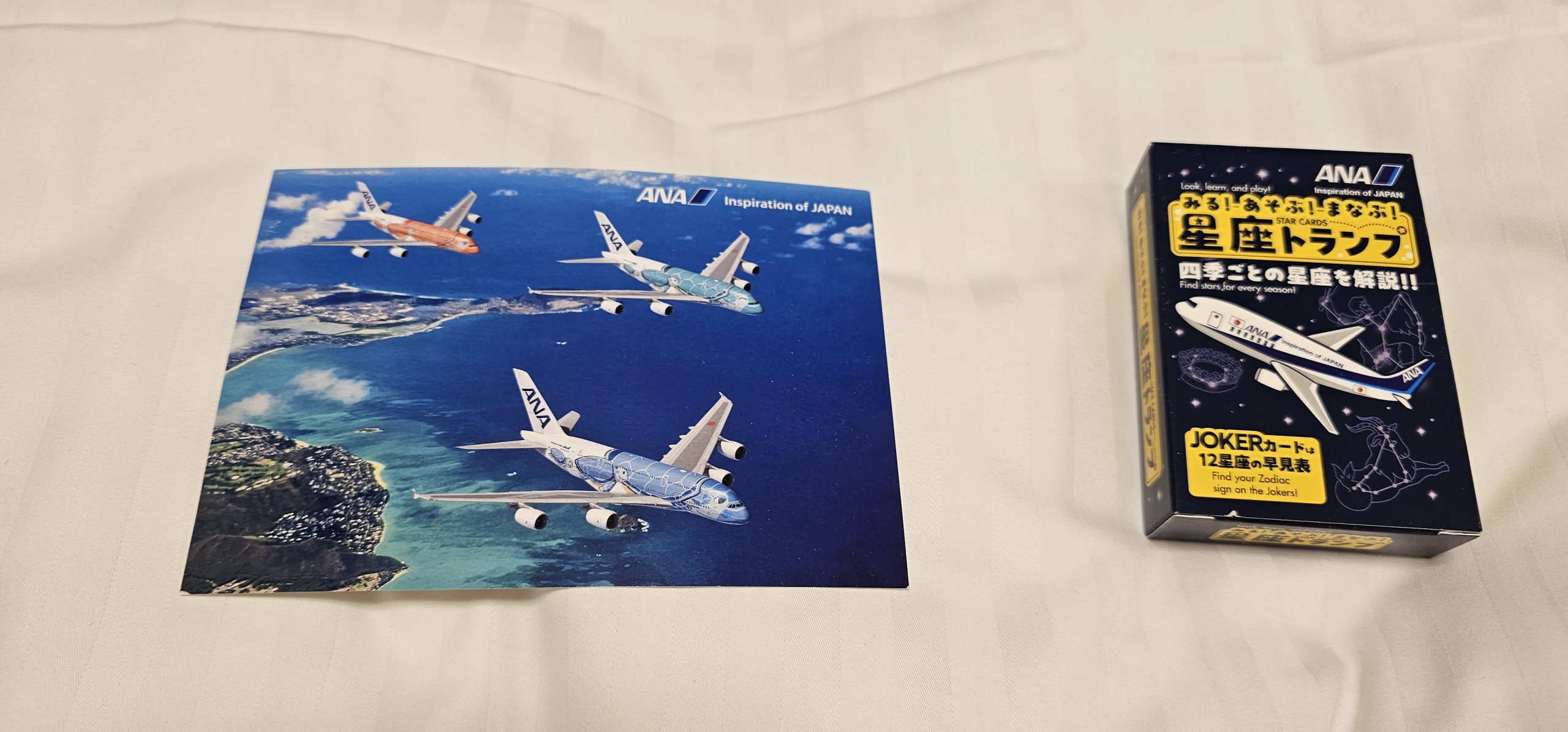 But look, there were postcards at the top of the box too! I got to keep one. In addition, I had inquired near the start of the flight whether they had packs of poker cards that I could request or not, as I know I had done that sort of thing while I was much younger. Not every airline has them (anymore), but some apparently still do. And ANA was one of them! Completely free too, I just had to ask for them: