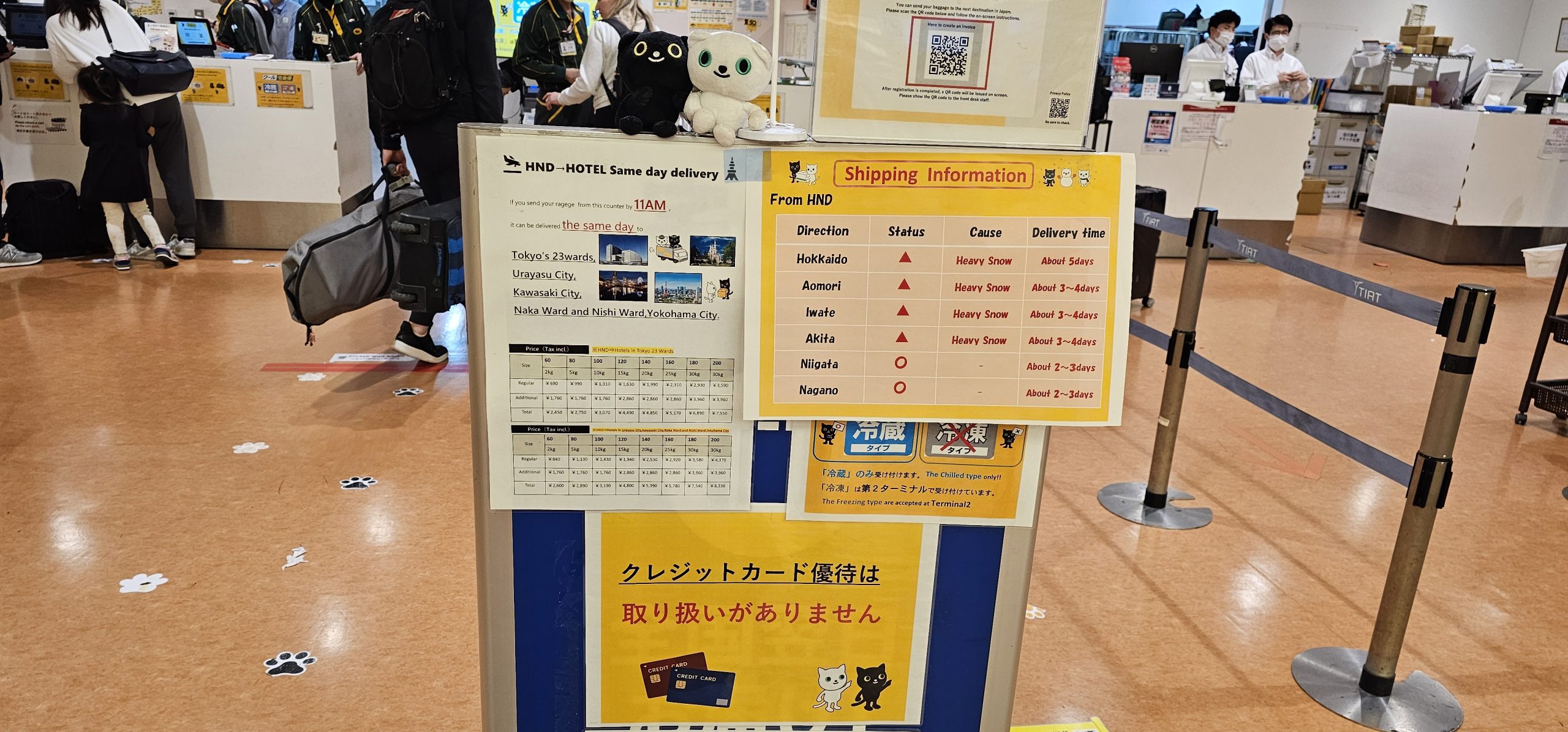 Oh.. ‘about” 5 days. I wouldn’t even be in my Sapporo hotel anymore by then. That was Yamato’s (local) freight timetable due to all the snow hammering Japan. JAL ABC (local) next to it, whose counter was manned by those two guys in the top right of the picture, didn’t mention the snow at all but said that their delivery to Sapporo would take “about 3 days”. Also too risky, since my hotel stay there was only for 3 days.