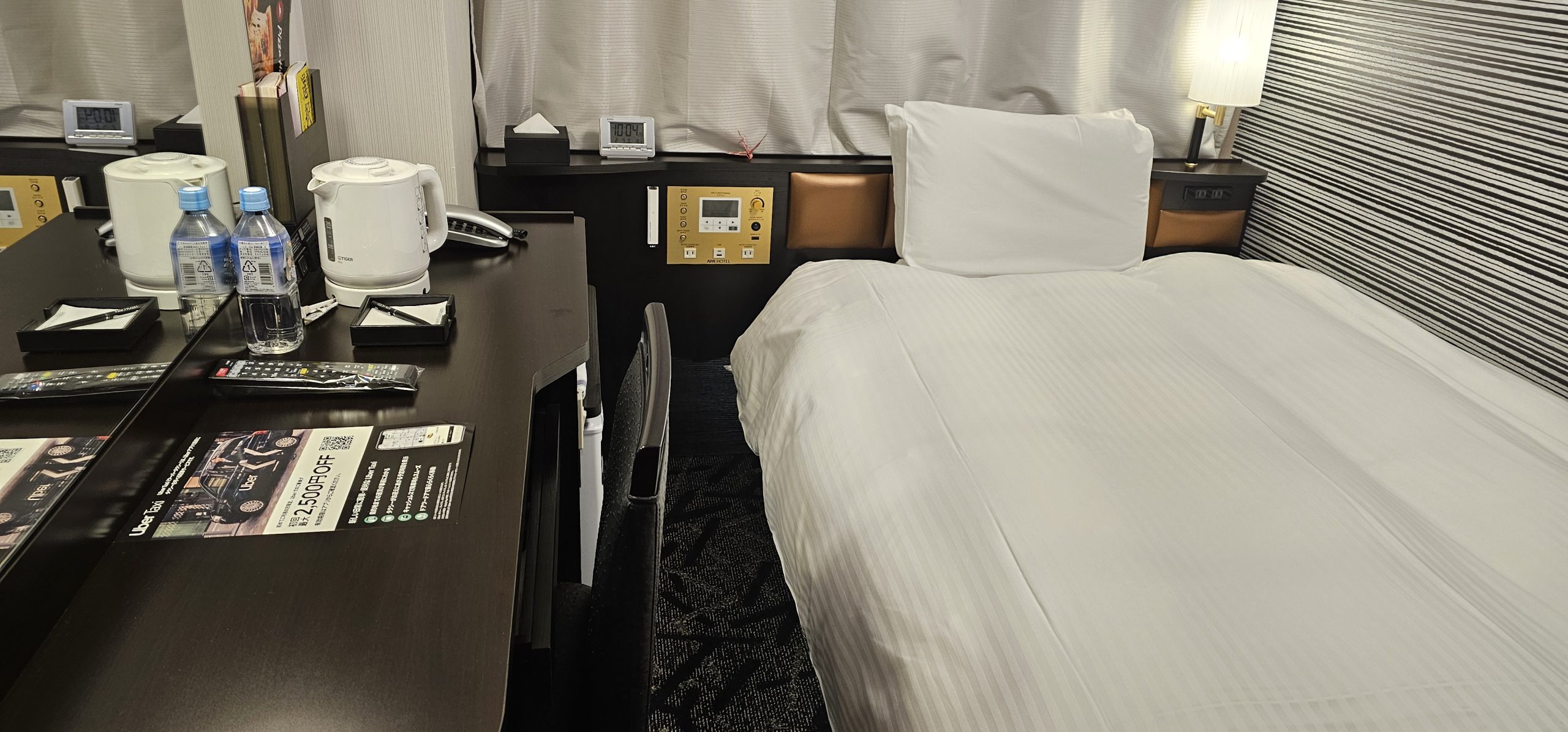 So I was glad when I reached the hotel room and there was a bottle of water waiting for me. The hotel I was staying at was the APA Hotel Keisei Narita Ekimae, in the city of Narita that both the station and the airport were named after, and my 8th-floor room looked like this: