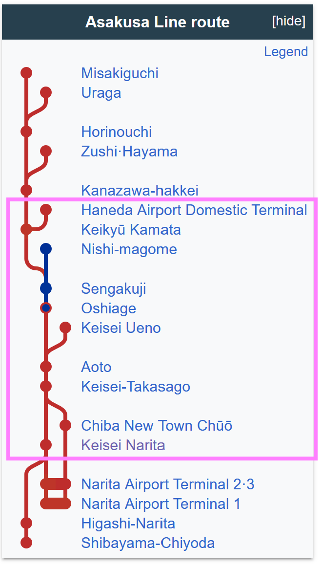 The hotel at Keisei-Narita, one train ride away, was about two and a half hours away from Haneda Airport by train. Before leaving, I had run my first day itinerary by Gemini with, among others, a note that I liked to collect paper ephemera, and it had helpfully taught me about a way to keep a paper ticket as a souvenir. On Jah‘s suggestion, I then took that reply and also ran it by ChatGPT. Gemini had noted that there was a direct train all the way there from Haneda to Keisei-Narita, ChatGPT then pointed it out as an error because they were on different lines, and Gemini then rebuttaled saying that it was NOT an error, and that the right train would just take you there through line switches using a system called Chokutsu Unten. And there is a graphic on that Wikipedia page, the “Asakusa Line route” map, that actually shows the connection, and my route would have me starting up at the Haneda Airport node and take the fastest train that “flowed down” the list.