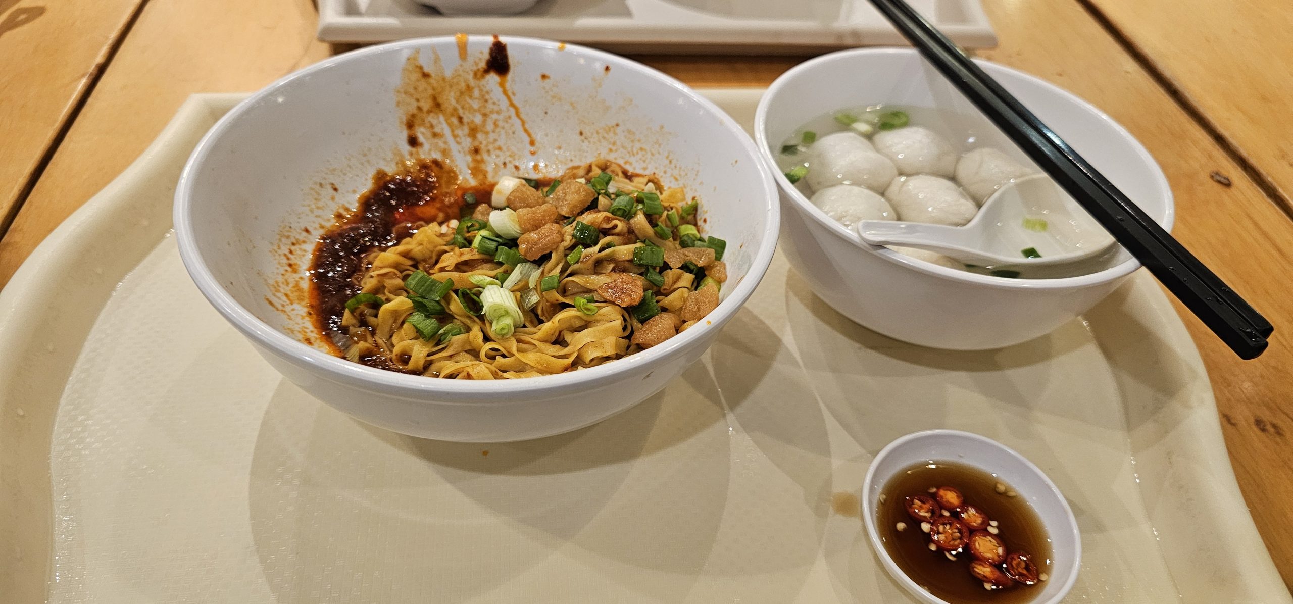 Our first stop was a store in that basement food court that she recommended, Li Xin Teochew Fishball Noodle. It was popular enough to have a modest line when we reach there, though Kaiting said that during the lunch rush, the line was much longer and (I’m paraphrasing here) stretched away from the immediate vicinity of the store and off into the distance. They were really efficient though and the line progressed quickly. Kaiting suggested the Fish Ball Noodle Dry with spicy Mee Pok noodles, and this rang up to $7.30 SGD ($7.91 CAD) and was fantastic.