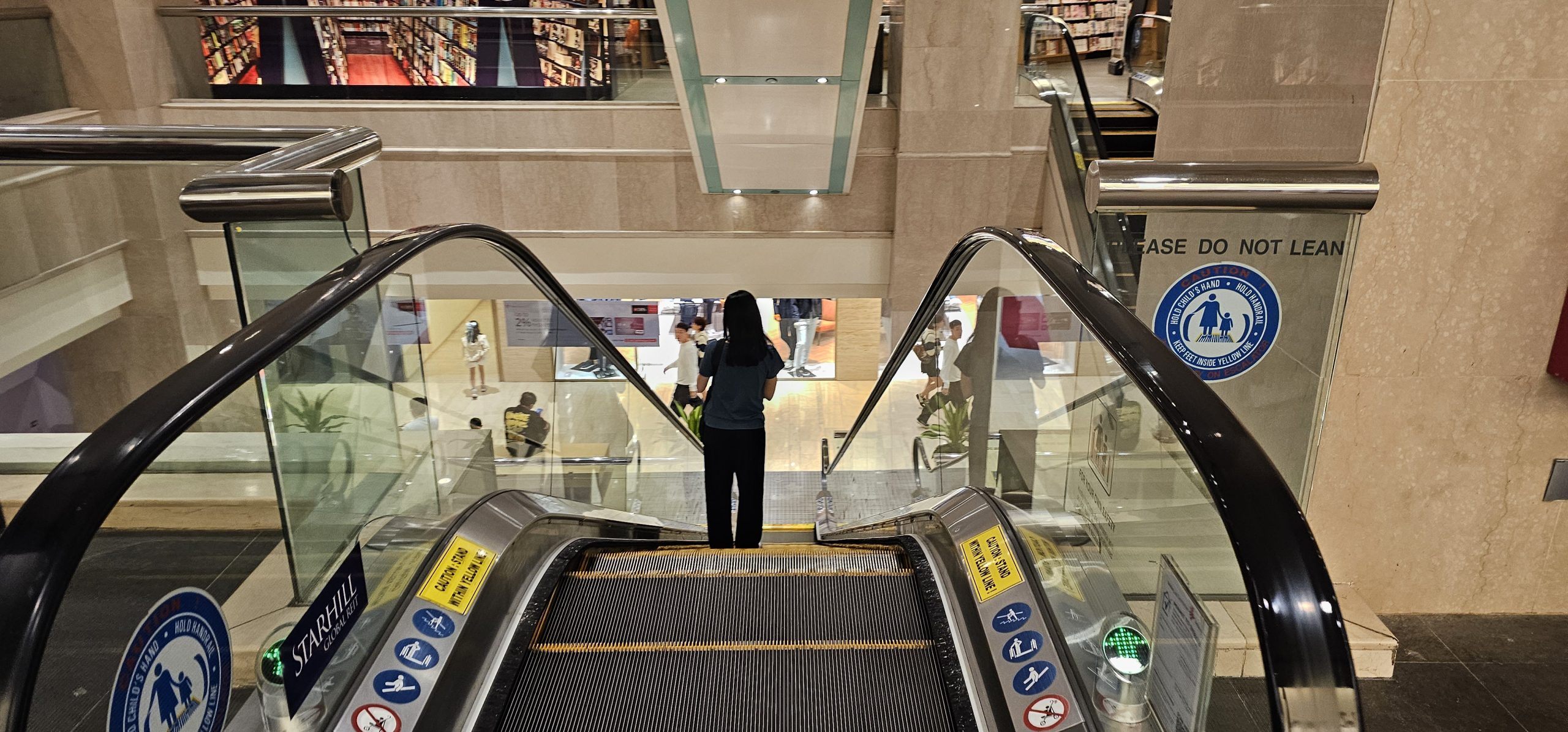 While we were walking around though, she got a beep on her phone from her mom and suddenly we realized that it was well past 7pm — we both swore it only felt like a couple of hours had passed, but somehow we had burned more than five hours walking and talking already. But alas it was time for her to leave, and I snapped my only picture of her from the day as she descended the escalator from the bookstore.