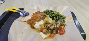 While in line though, I glanced back at the table and saw an uncle looking confusedly at the bottle, I guess trying to figure out if that was someone’s discarded water bottle or an actual chope (which is usually, but not always, done with a pack of tissue paper, but there was a giant fan blowing at that table). Or maybe he was wondering if it was possible to take half the table. He also put his water bottle down, at which point I broke line and hustled back to the front and confronted him rudely.. just kidding. I hailed him and said that that was my water bottle but that I was alone and he was welcome to share the table of 4 if he liked.