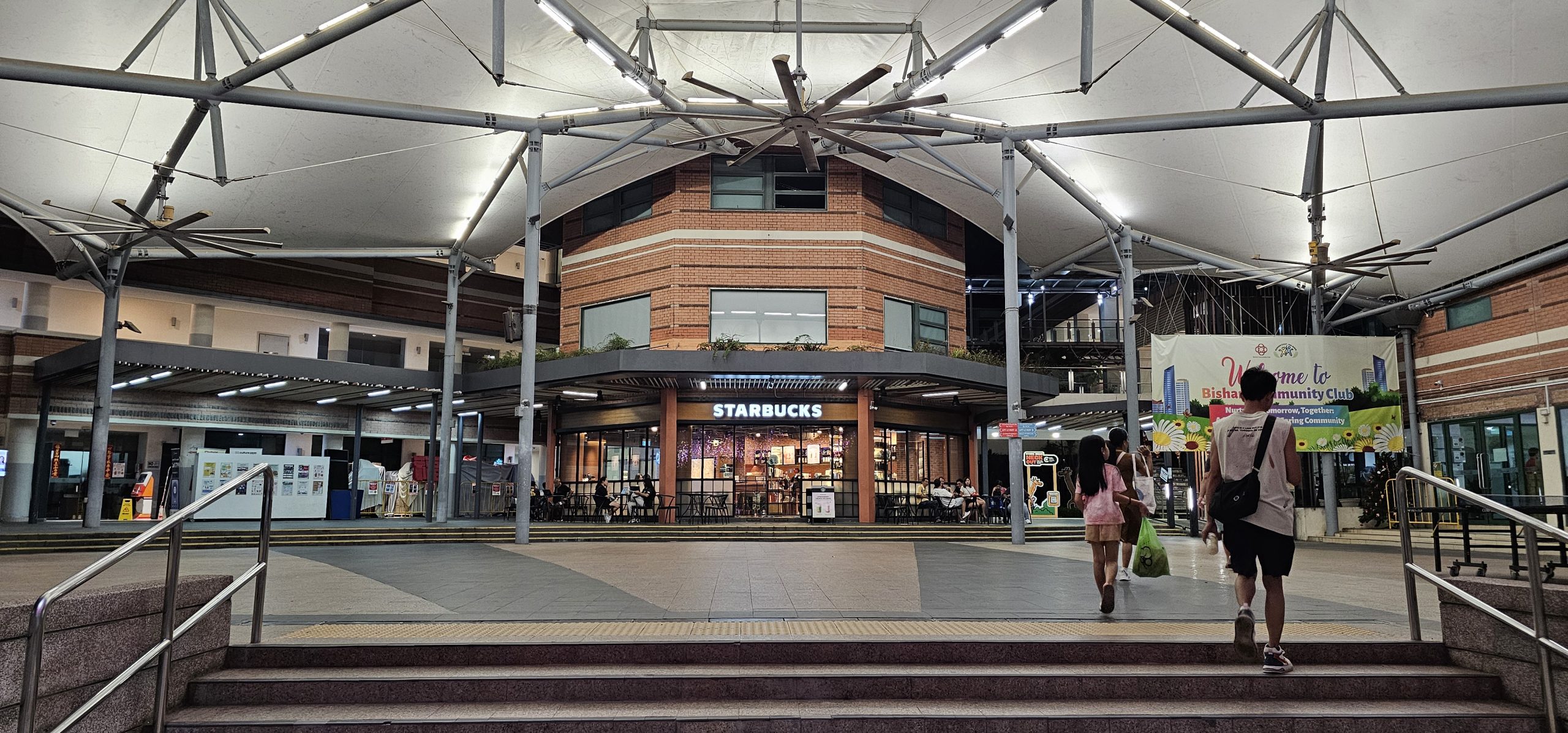 I walked east and south from the train station past a large, fancy gazebo next to a bunch of outdoor heartland shops that was collectively known as Bishan Mall: