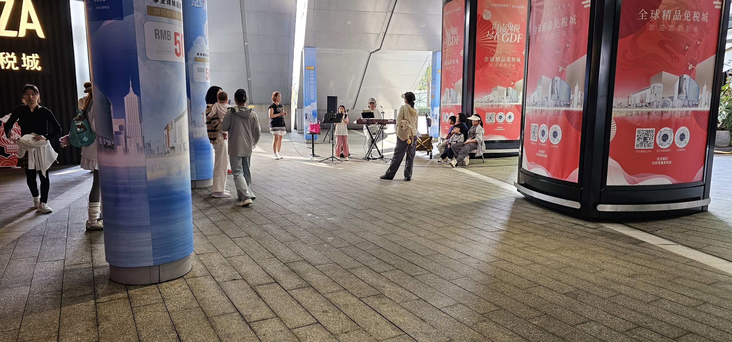 And there were some outskirt areas between adjacent buildings, away from their central-facing portions, that were much less crowded than the middle. One such area had a girl happily singing to passersby while an emcee presided over her: