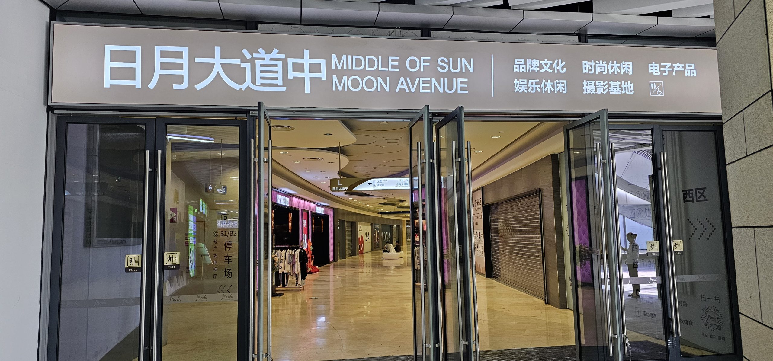 And the Riyue in Riyue Plaza is written as 日月, where the first character means sun and the second one means moon. So the connecting corridors between the two got translated into things like “Sun Moon Avenue”: