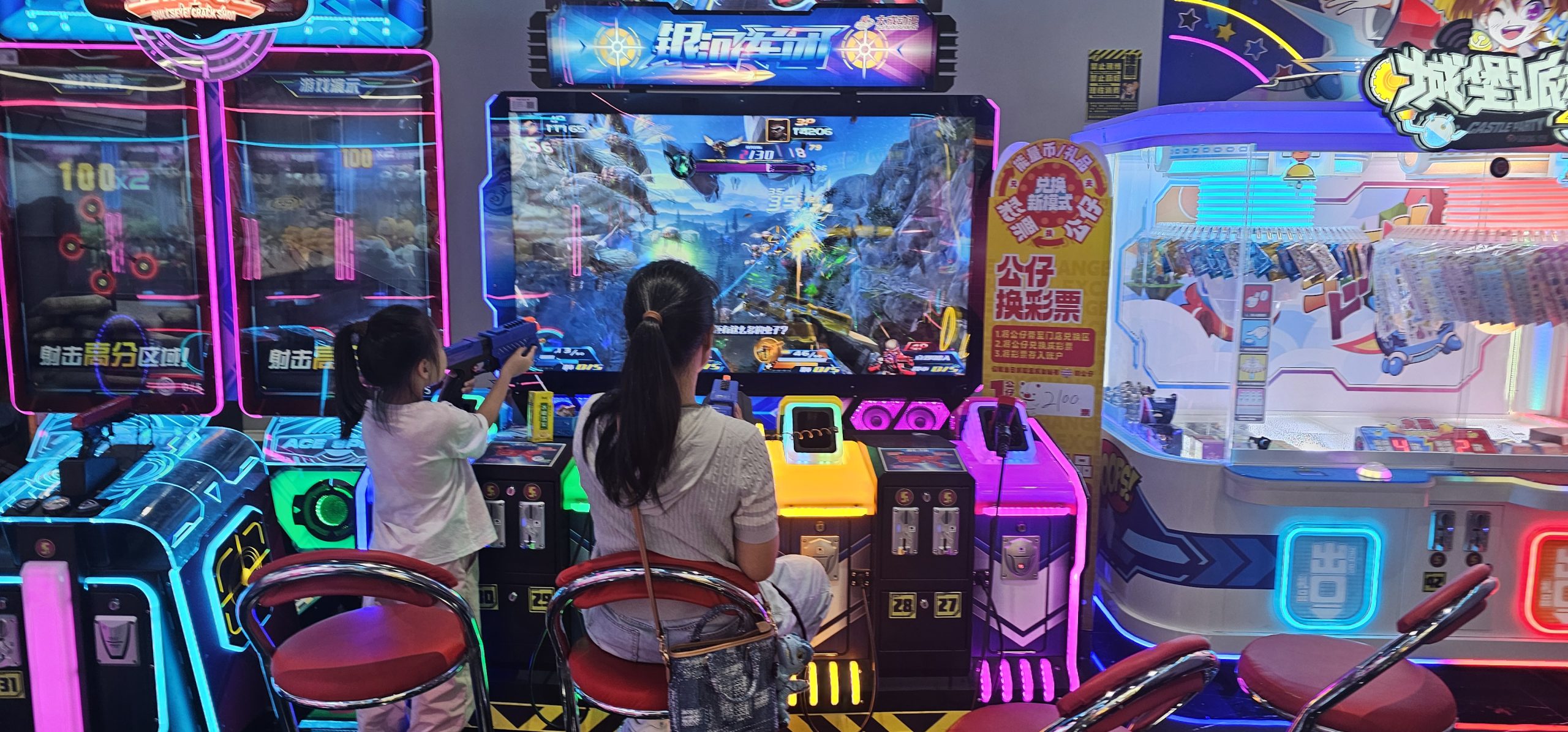 This arcade where a mom and her young daughter were playing a shooting game and doing quite well to boot:
