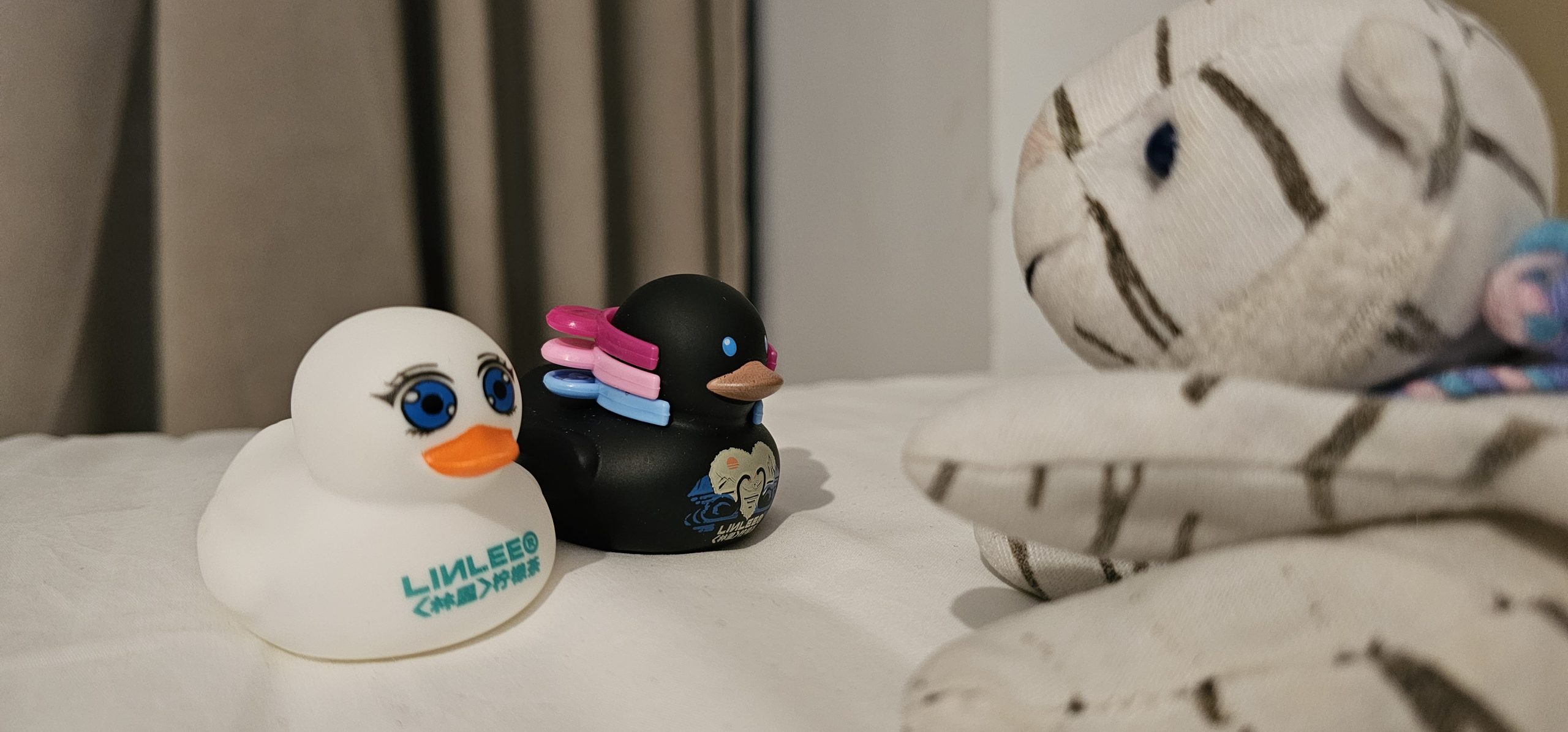I went back and forth between the two stores before eventually settling on this one, and just in time too because they started closing about halfway through my meal. They did offer free rice though, which was nice, and at one point soon after I first sat down, a random white Linlee duck came floating by on the conveyor belt tray too, left there by another customer’s kid (as far as I could tell). The server and I had a laugh, and she moved it aside to the cash register area after I removed it from the conveyor belt, but I did end up taking it home with me at the end of the day too, much to Tigey‘s perplexity: