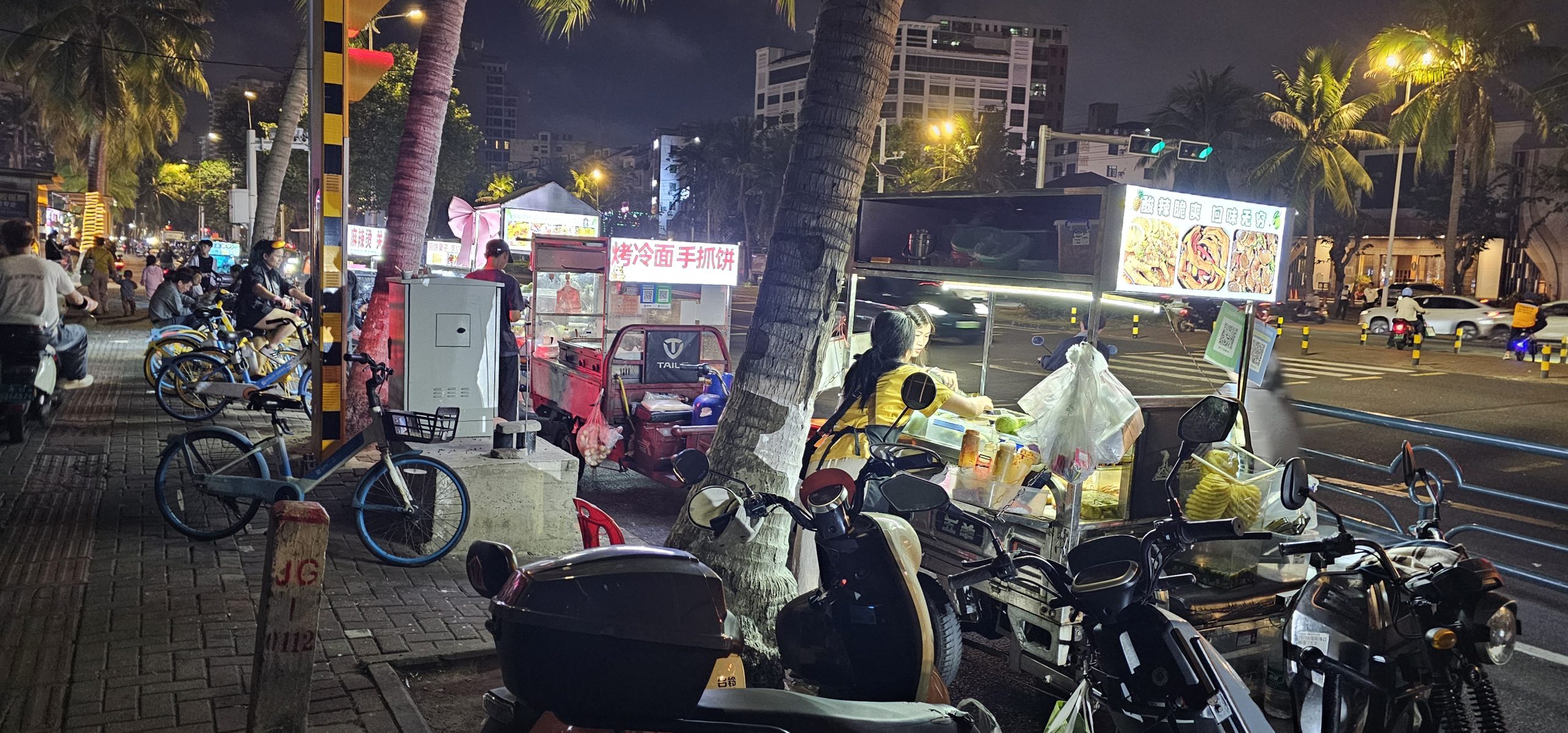 I took another Didi back to my mall hotel after that, which cost me 10.7 yuan ($2.13 CAD). Outside the mall, I saw a bunch of roadside vendor stalls set up, trying to cater to the hordes of motorcycles and scooters going by: