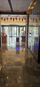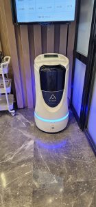 After finishing yesterday’s blog, I laid out my plans for the day, to wander around one of the districts not far from here and simply take in the sights and sounds. It was also 2 pm at that point, so lunch was on the menu as I prepared my treasure-hunting gear. I took the elevator downstairs and left the hotel, then immediately realized that I had forgotten to do something back in my room, so I went back into the hotel. As the elevator doors opened, I started a surprise as a little wheeled robot came gliding out of the elevator with no one else in it. I took a picture of it rolling off towards the front desk: