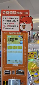 The balls go into the machines and you get prize tickets (and some balls) back from them, and apparently you can get bonus tickets from using certain number thresholds of balls at once or by buying balls once per day or something, like a daily gacha mechanic brought to the real world. How weird. Then you bring the prize ticket to this redemption booth to collect your items.
