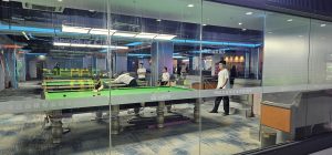 It was mostly deserted, but there were a couple of tables on the left with tablets on them with a nice view of the city below, and a couple people sitting at said tables.