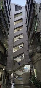 Wowww, I was on a rooftop, but not in the traditional sense, this was a 4th storey rooftop that was also the “ground level” of a bunch of very intimate residential buildings here, and had no actual access to the “edge” of the roof that I saw, as it was all apartment buildings going way up. Some of the apartment doors were on this level itself too, directly accessible from this rooftop, since it was basically the ground level of the apartment. A food delivery person scuttled by, as did a couple of other residents, and they all got into an elevator headed down, But it was too cramped and I didn’t want to get in with them, especially since they were all guys too, so I instead took this seedy staircase down.