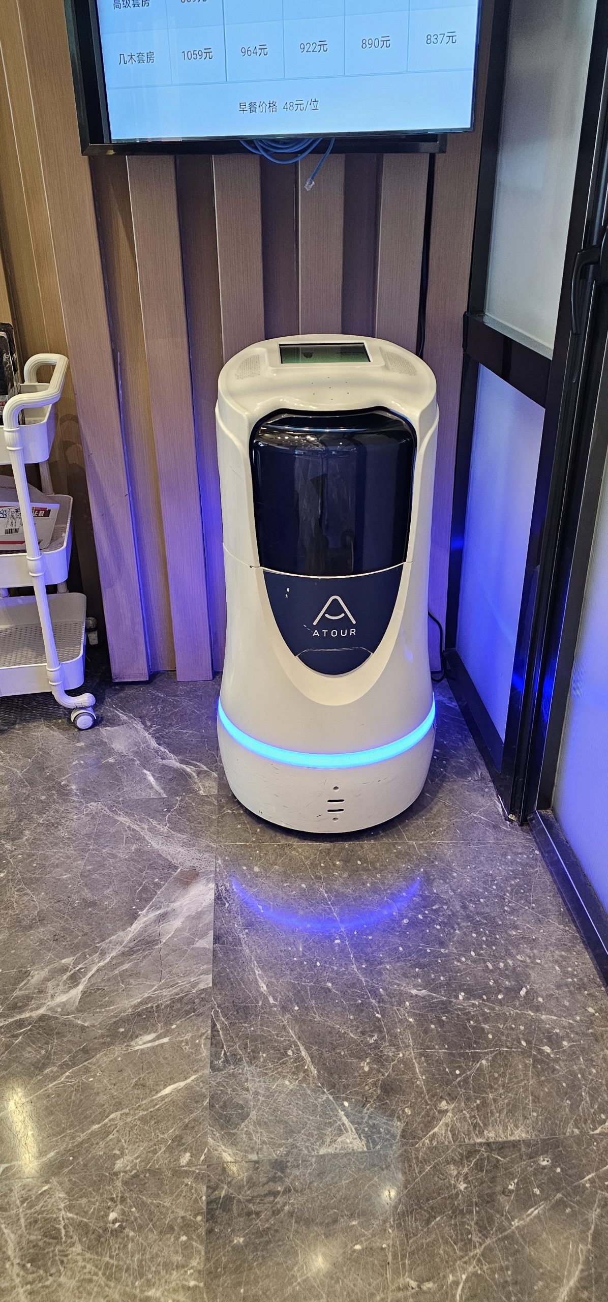 After finishing yesterday’s blog, I laid out my plans for the day, to wander around one of the districts not far from here and simply take in the sights and sounds. It was also 2 pm at that point, so lunch was on the menu as I prepared my treasure-hunting gear. I took the elevator downstairs and left the hotel, then immediately realized that I had forgotten to do something back in my room, so I went back into the hotel. As the elevator doors opened, I started a surprise as a little wheeled robot came gliding out of the elevator with no one else in it. I took a picture of it rolling off towards the front desk: