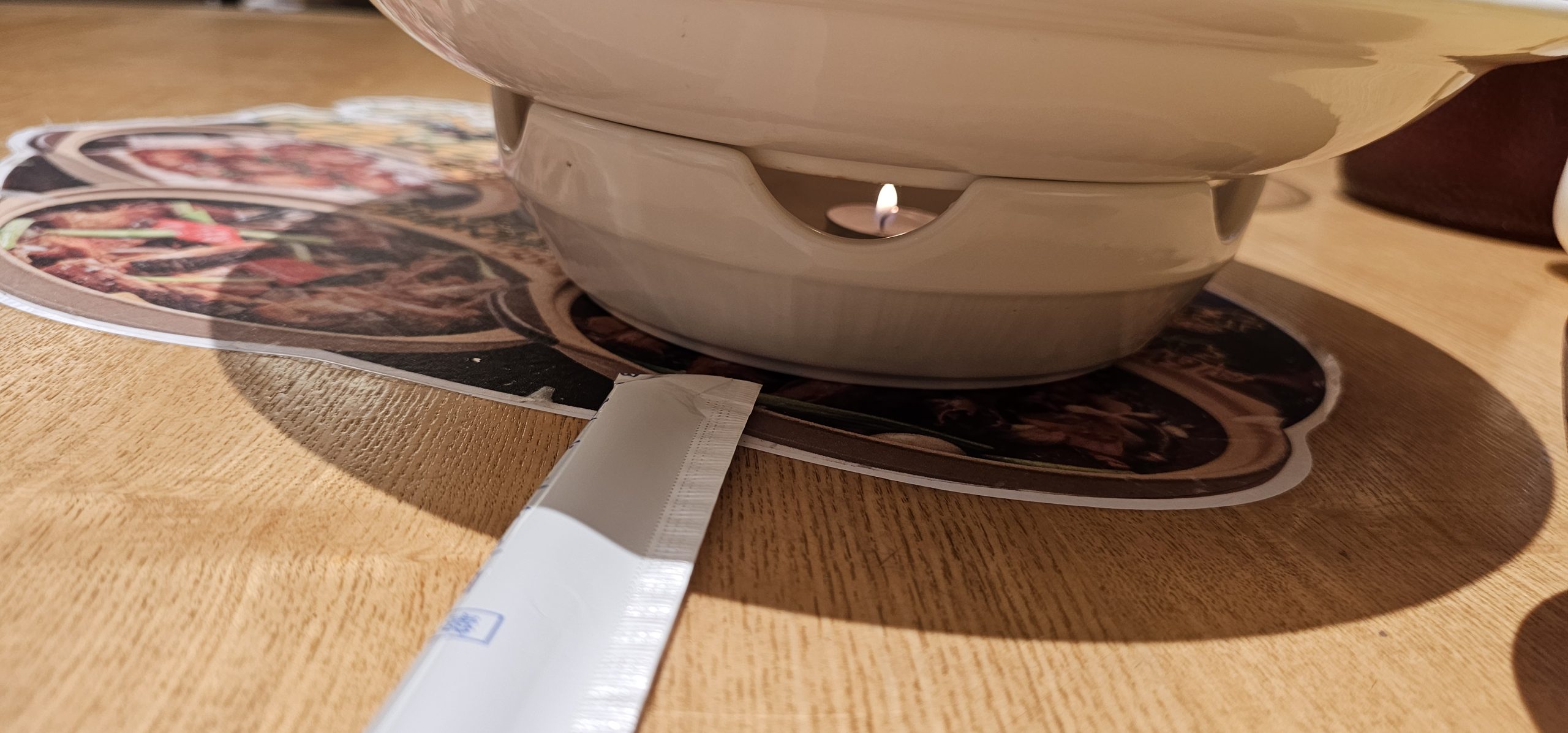 Huh, that was kind of neat. Never seen a place to that. The candle was still gently burning its life away when I was done my meal. There were also large flasks of.. wine? on the side.