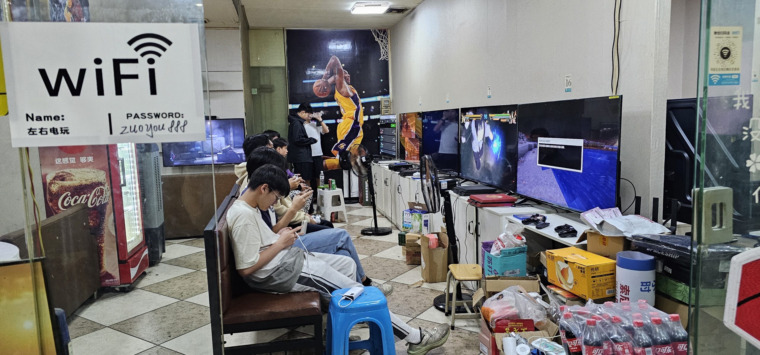 A video arcade store with lots of kids playing on consoles there, and oh, they’re also broadcasting their Wi-Fi password to the world…