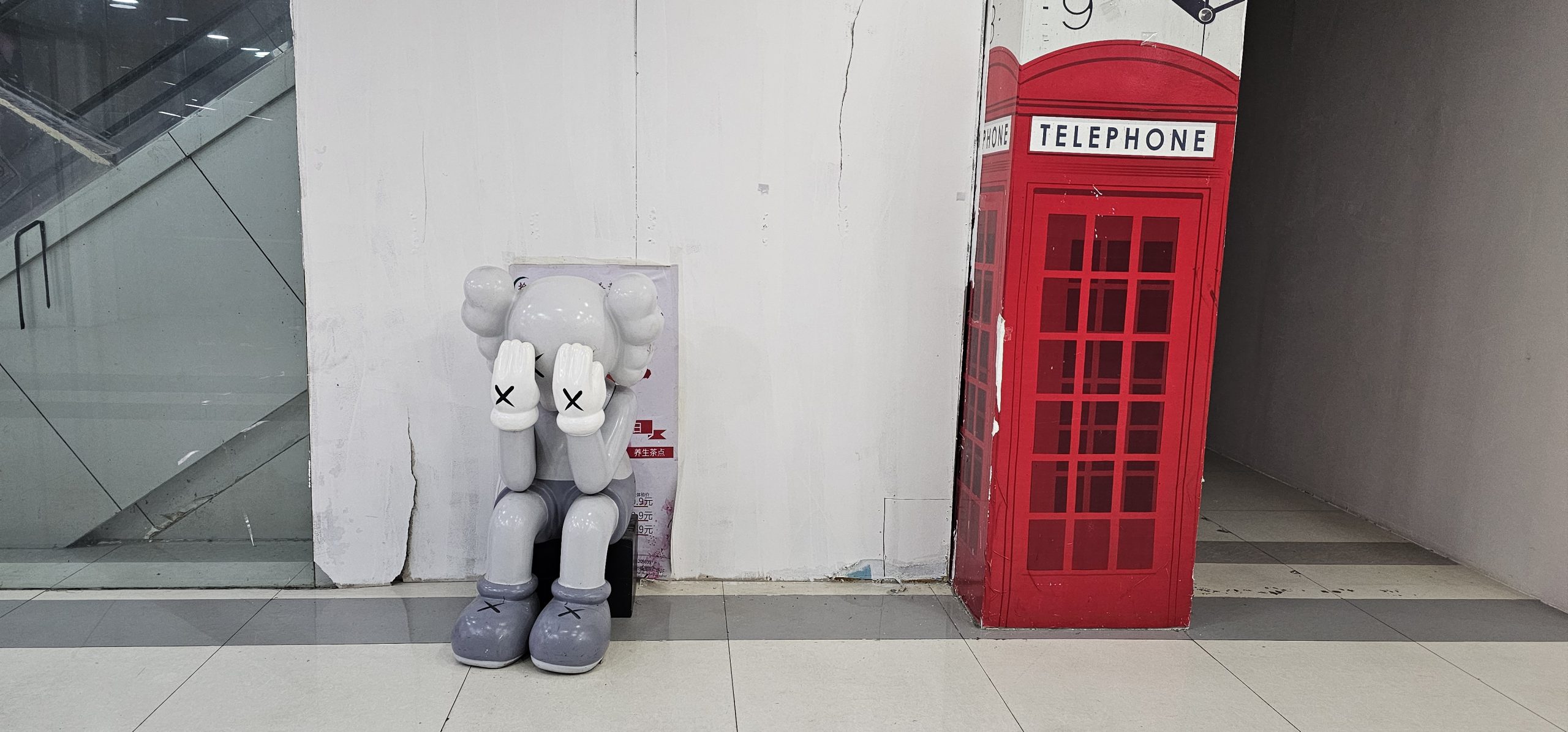 Why were they so sad? I had no idea what they were, so I showed a picture of it to Gemini, who promptly told me that this was a character from an American artist named KAWS, called Companion, which was extremely popular in China. Also, while a little derivative, it’s also basically considered a bootleg Mickey Mouse icon here, or at least part of the reason why people like that aesthetic. I’m pretty sure I’ve seen it in more upscale malls too, and they’re meant to be there for charming photo ops and such and isn’t actually supposed to carry such a look of depression, but the setting here certainly makes it look so!