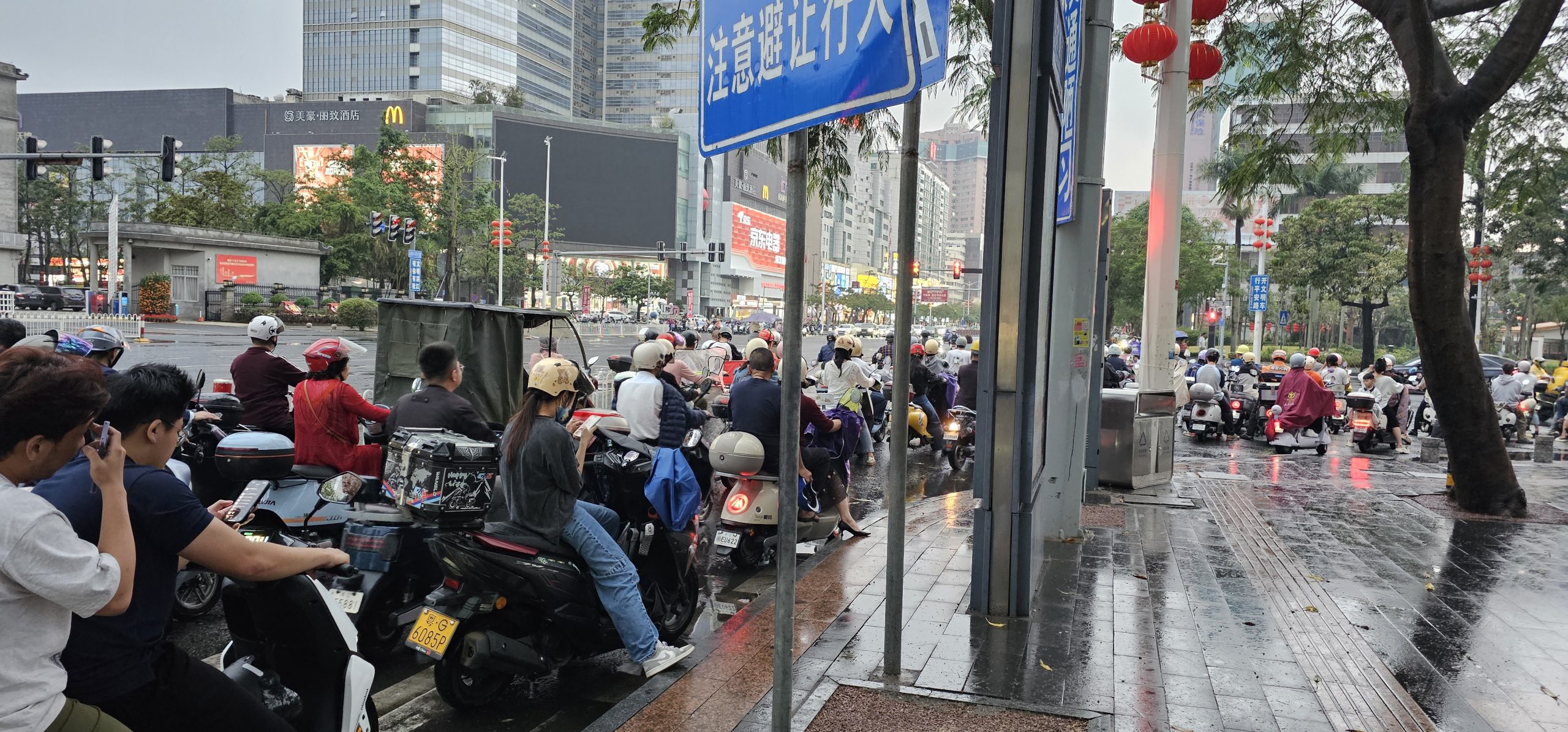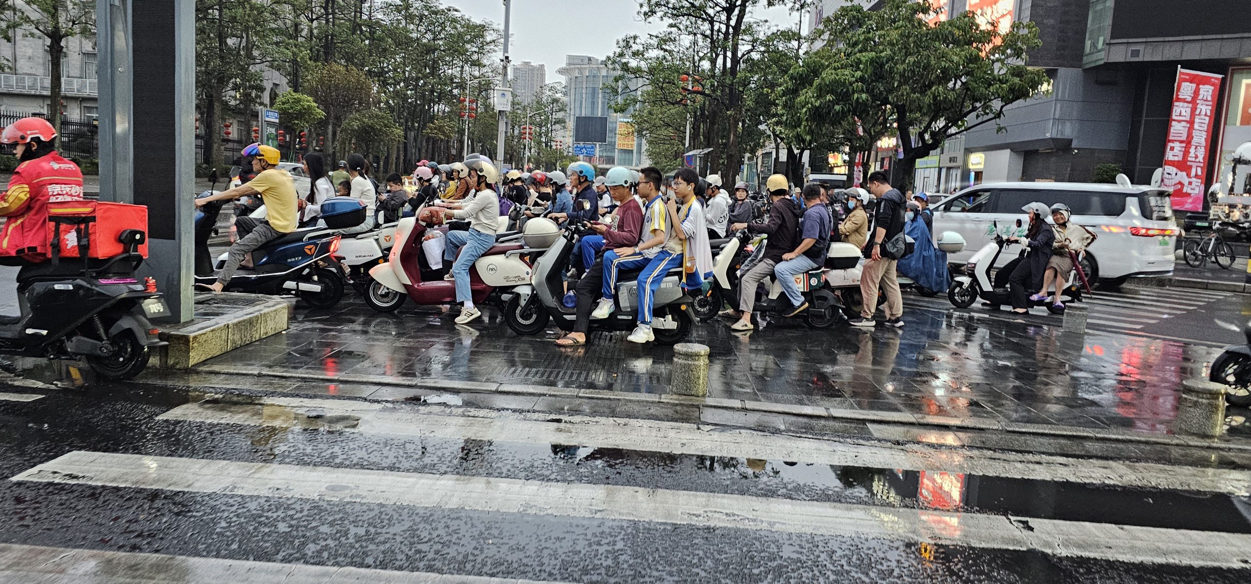 From here, I left the mall as it had ceased to rain, and saw some interesting looking malls diagonally across the street from this one, so I waited to cross the road, eyeing the horde of motorcycles here. According to Amap, there was a large, ovallish road loop here the size of two city blocks between Renmin West 4th/5th Road and Renmin South Avenue that several other roads fed into, so it seemed like it would be a busy part of the city vehicle-wise, and it sure looked that way.