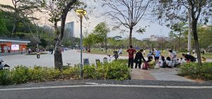 We walked back out through the front of the park by where we had entered again, pausing long enough for me to take another picture of the same place from a different angle. There were people playing badminton, kids pushing around big balloons, bicycles and tricycles rushing by, I really liked the vibe.