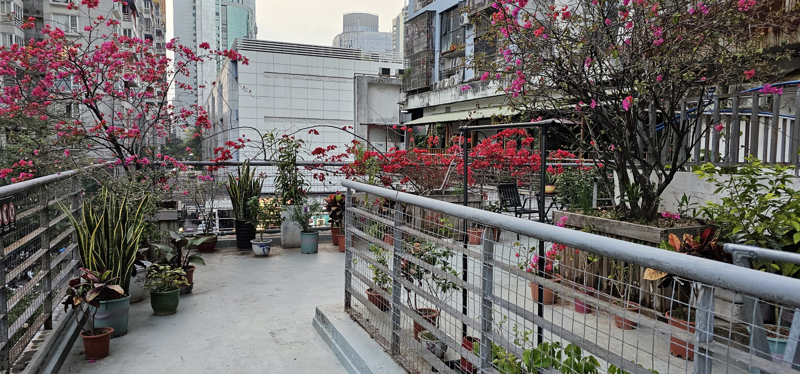Cool, a community flower garden! This was probably technically a semi-private space, but another set of stairs behind us which was locked, as well as a corridor to the right of the flowers which was supposed to be locked but was being kept open for airflow, led to the actual housing units around here. We didn’t go that far, we just enjoyed the third floor rooftop garden for a minute or two. Looking down, I was also intrigued by the view we had: