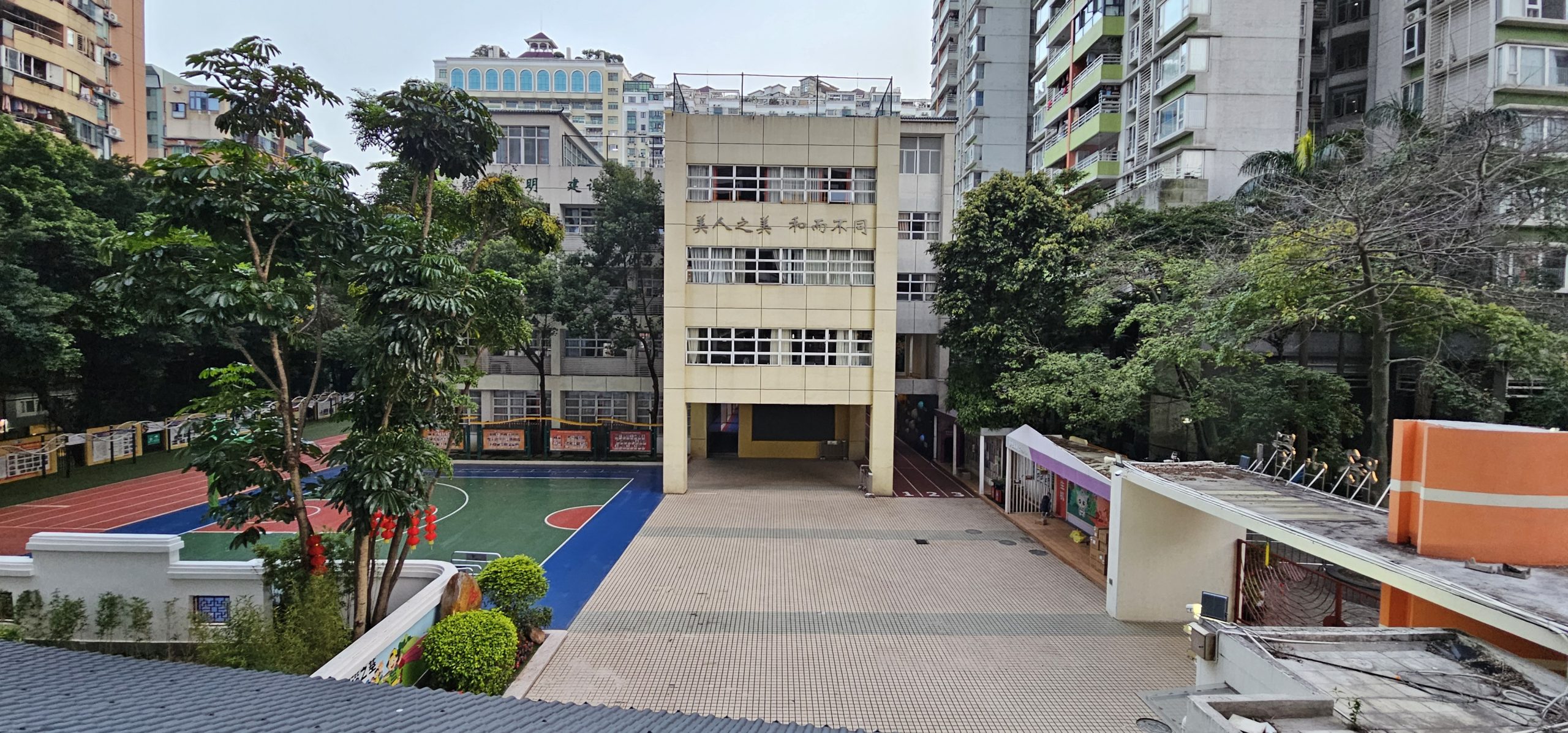 We were looking right onto the school grounds of an elementary/primary school, Tianfu Road Primary School (天府路小学). It really struck me how close we were, how intimate the residential buildings surrounding the school were with the school itself. A worried grandparent with nothing better to do could just sit around here and watch her kids in school all day! Or toss them a lunch bag! Or hold up signs with exam answers! Okay maybe not that one.