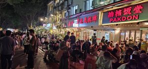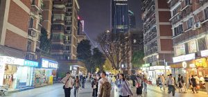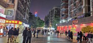 The streets eventually led to one larger, central, main street in the area. This place was wide open and there were plenty of people, young and old, out enjoying the evening air. Here’s a left, front, and right view of the street where we turned into it, with the light show in the third picture being from the Canton Tower in the far distance.