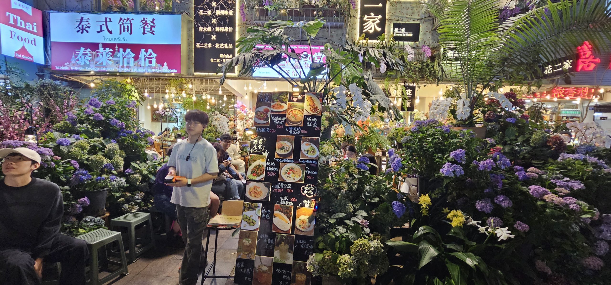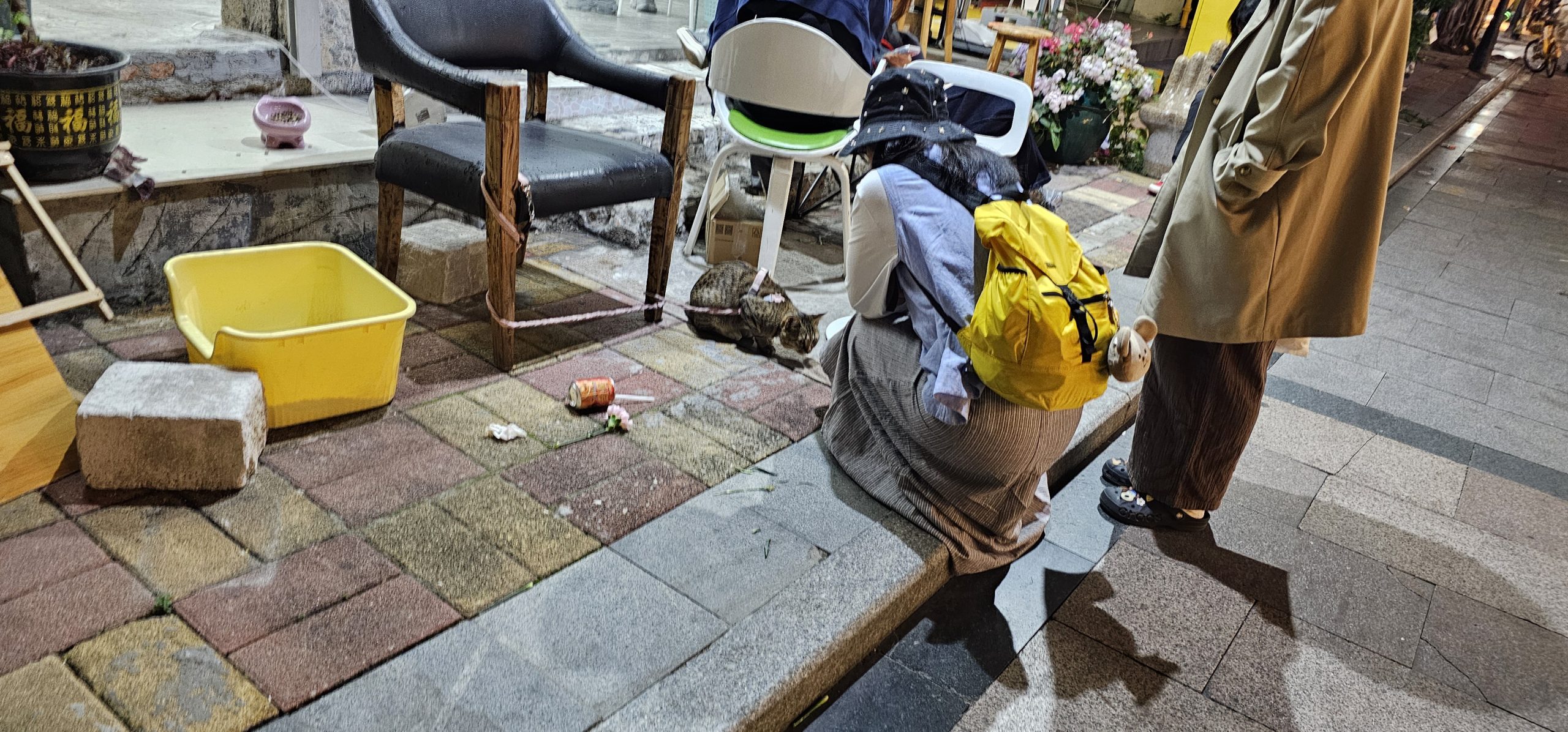 This was, as far as I could tell, a large, chic neighbourhood called Tianhe South, filled with things like boutique shops and restaurants tucked away below residential buildings. It was such a fascinating place with fascinating scenes. Here’s a leashed cat and a female passerby playing with it:
