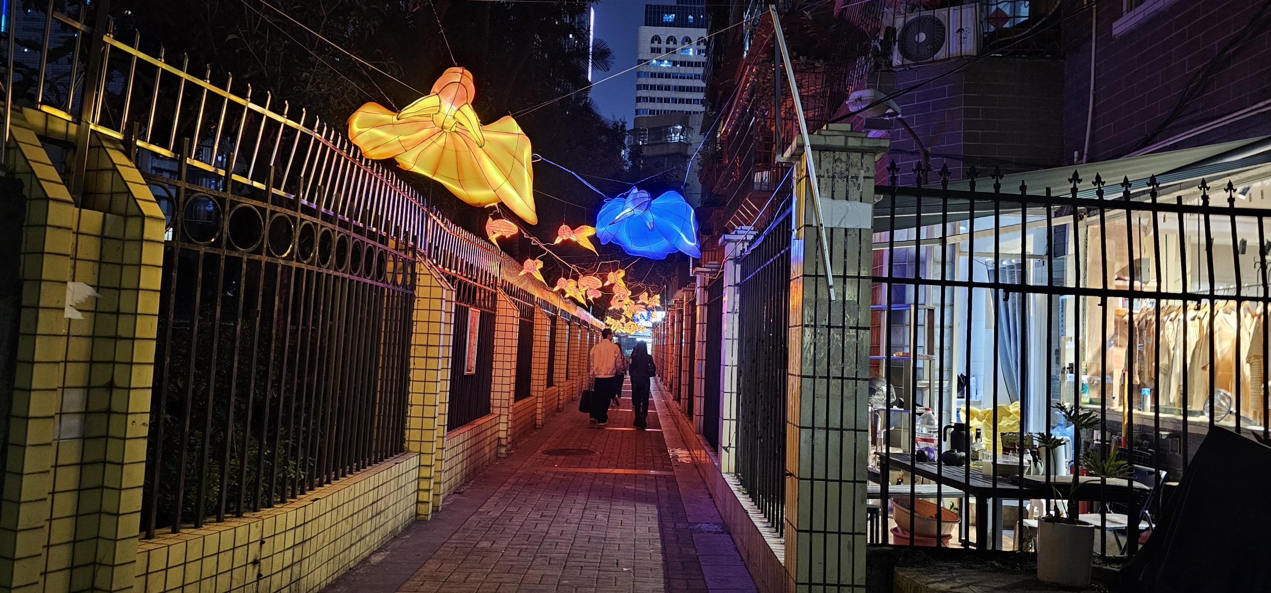 And a row of lanterns lighting a back alley connecting a couple of different streets.