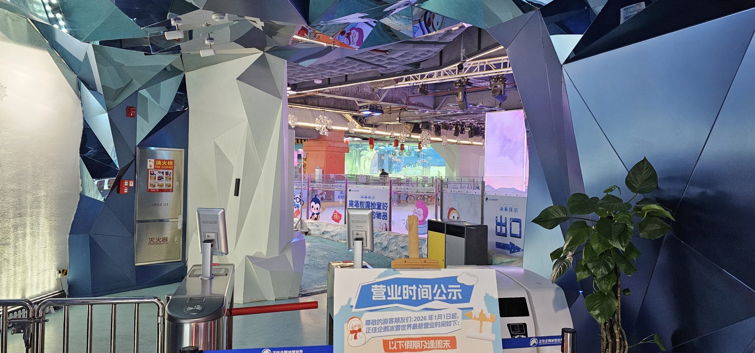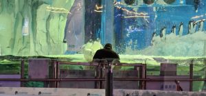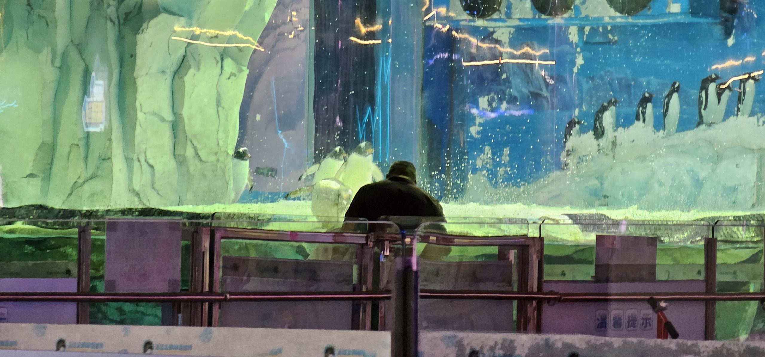 Here’s an ice area and then a 10x zoom on a father (and her daughter, not pictured) enjoying the sight of penguins on the 7th level of a mall, far away from their native habitat.