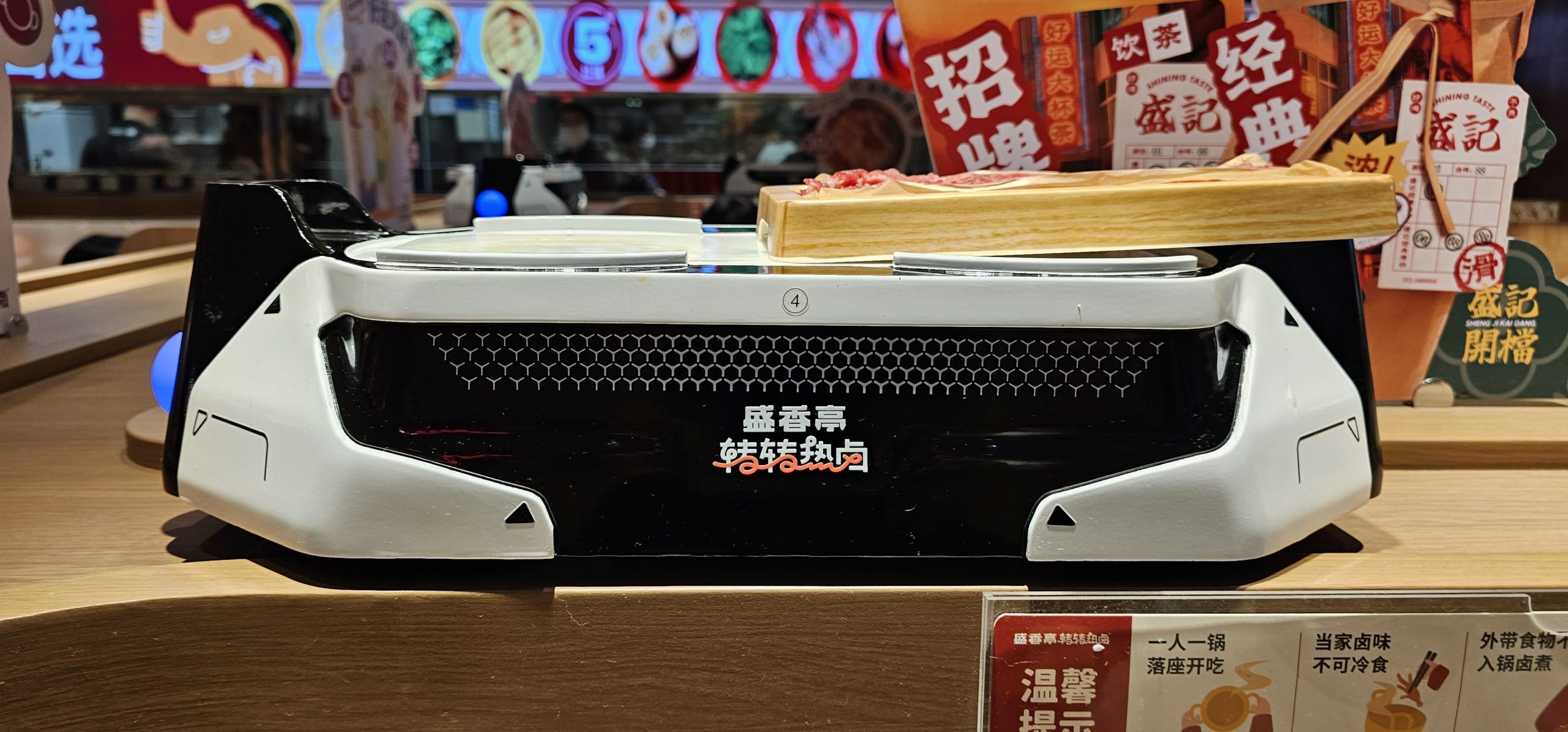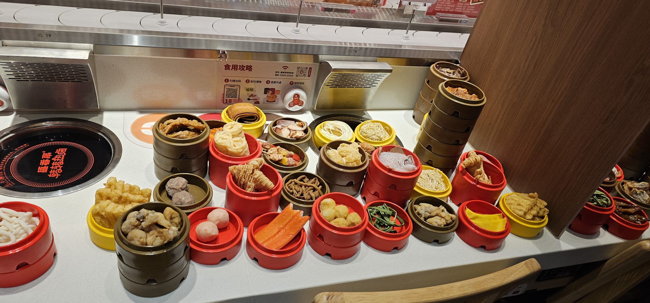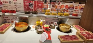 This hotpot store was cleaner and cheaper than the last one I went to, and it had a lower conveyor belt of bowls going by as well as a higher open area where a wheeled robotic device would come by with any meat dish that was ordered from the kitchen directly.