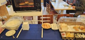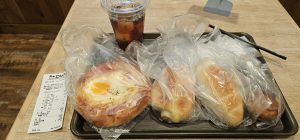 It turns out that the bakery on the right sold both bread in bags as well as loose pieces of bread on trays. You could go in with a tray yourself and pick out what you want, in a way that strongly reminded me of Akira‘s trips to the bakery with me way back in 2022 in Kyoto. Then you brought your tray up to the front, where the cashier would ask you, for your loose pieces, whether you wanted to eat them here or pack them for home (or a combination thereof). The ones that were already in bags were obviously for take out, and the ones that were loose could be either. You could also order some tea from the cashier at that point:
