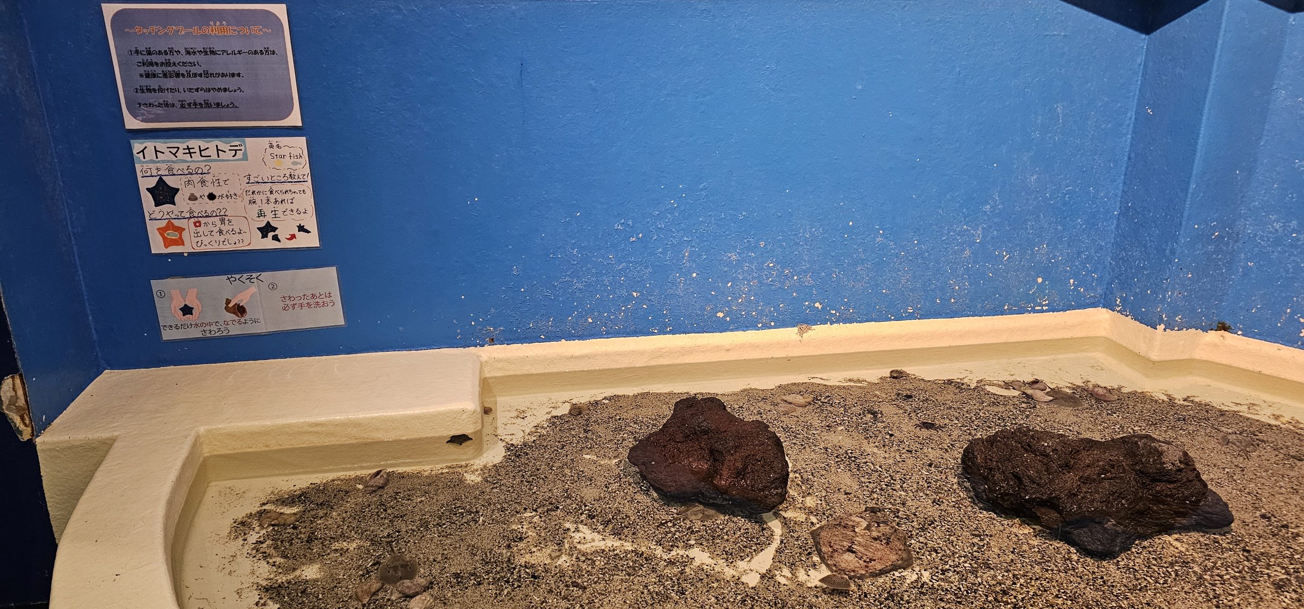And a Japanese aquarium staple! The chin anago, or garden eel, sticking vertically out of the sandy ground: