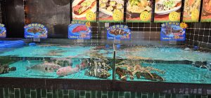 There were a bunch of people sitting on coloured chairs in front of fish tanks outside of this one restaurant.