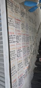 The street eventually dumped me back onto the main road, and I looked at my map and found that I was three blocks or so west of where Beijing Road actually was. I followed the road north and around and caught sight of this, which seemed to be a real estate agent… listing his properties on paper on the side of a stairwell.