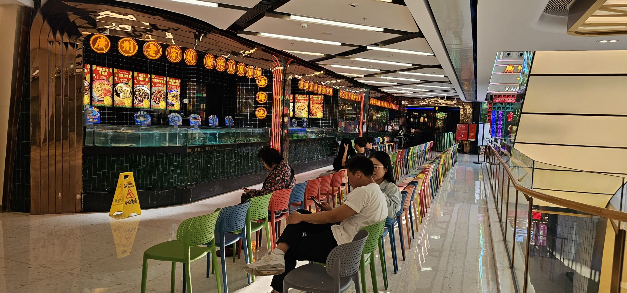 There were a bunch of people sitting on coloured chairs in front of fish tanks outside of this one restaurant.