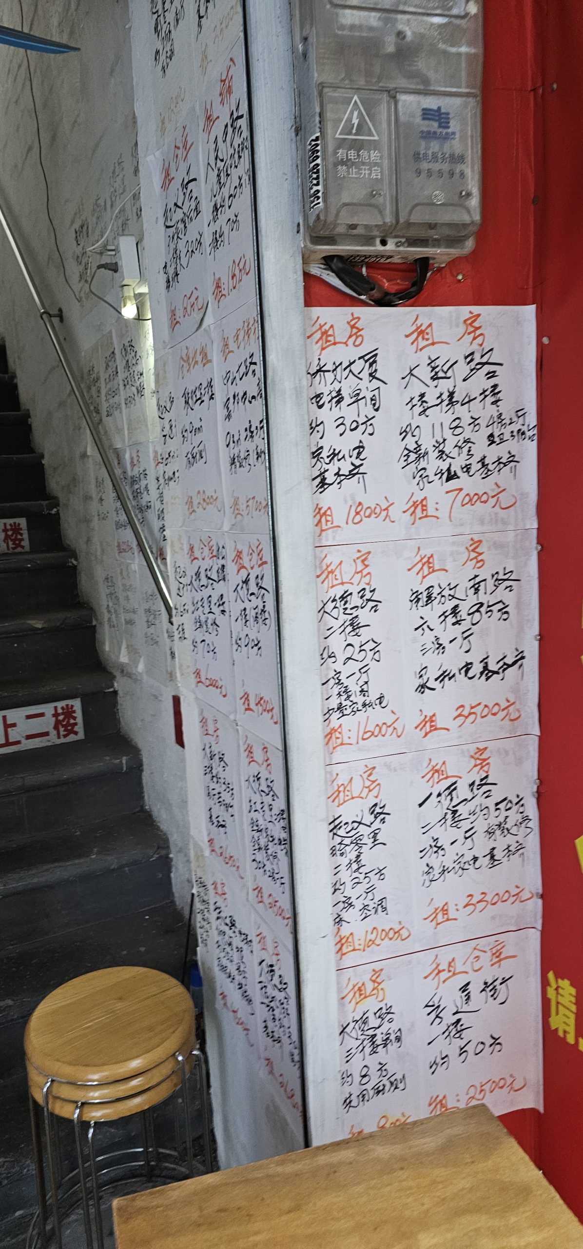 The street eventually dumped me back onto the main road, and I looked at my map and found that I was three blocks or so west of where Beijing Road actually was. I followed the road north and around and caught sight of this, which seemed to be a real estate agent… listing his properties on paper on the side of a stairwell.